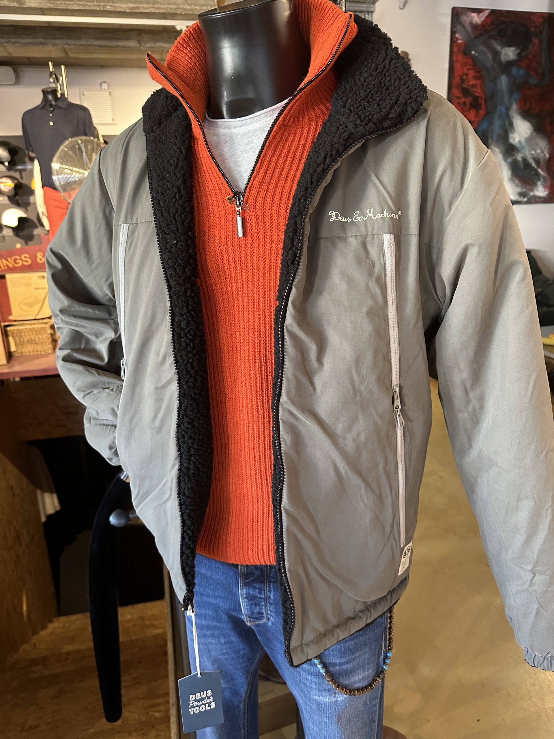 Mega Jacke vom Kultlabel Deus ex Machina, die Jacke kann man von wenden und von beiden Seiten tragen.