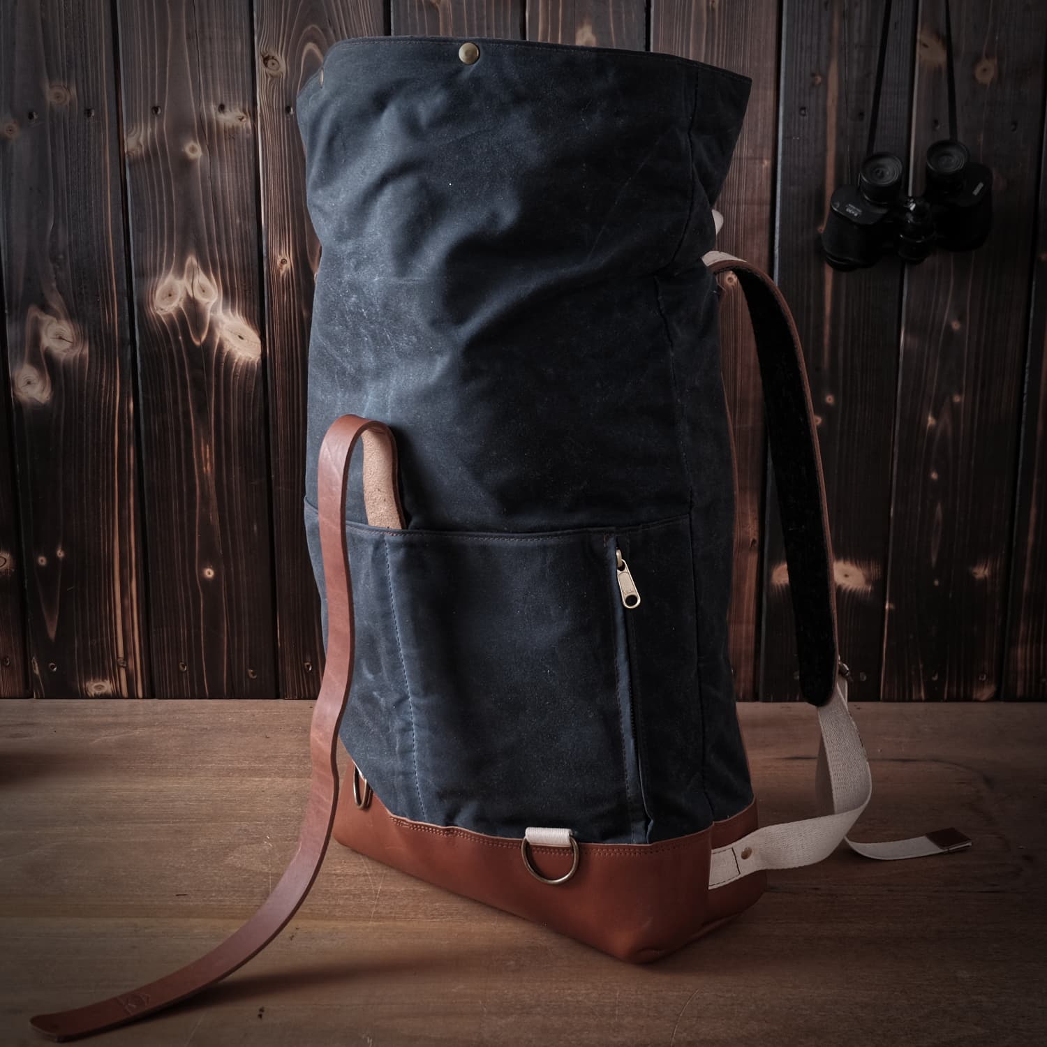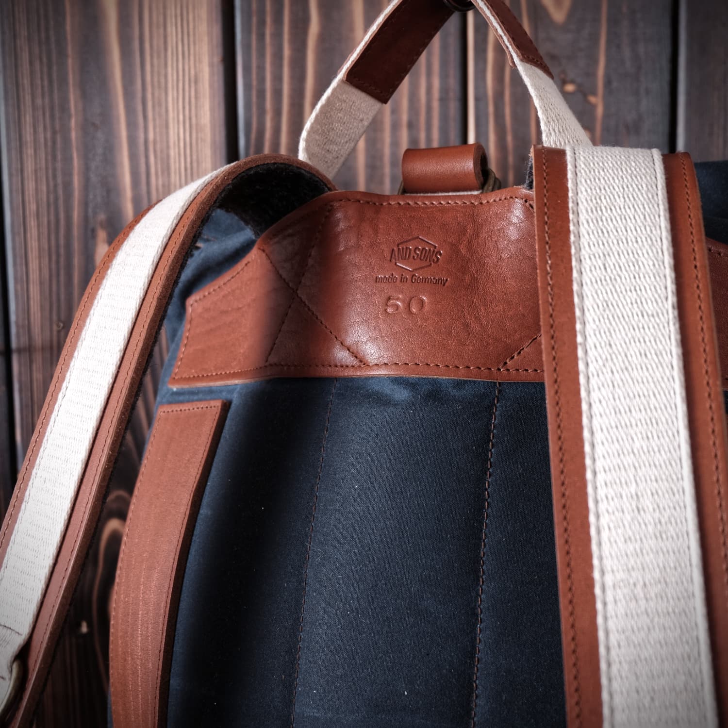 Das Außenmaterial ist ein stabiler, gewachster Baumwollstoff kombiniert mit pflanzlich gegerbtem Leder, das Innenfutter besteht aus Wollfilz.